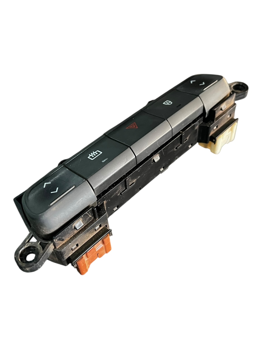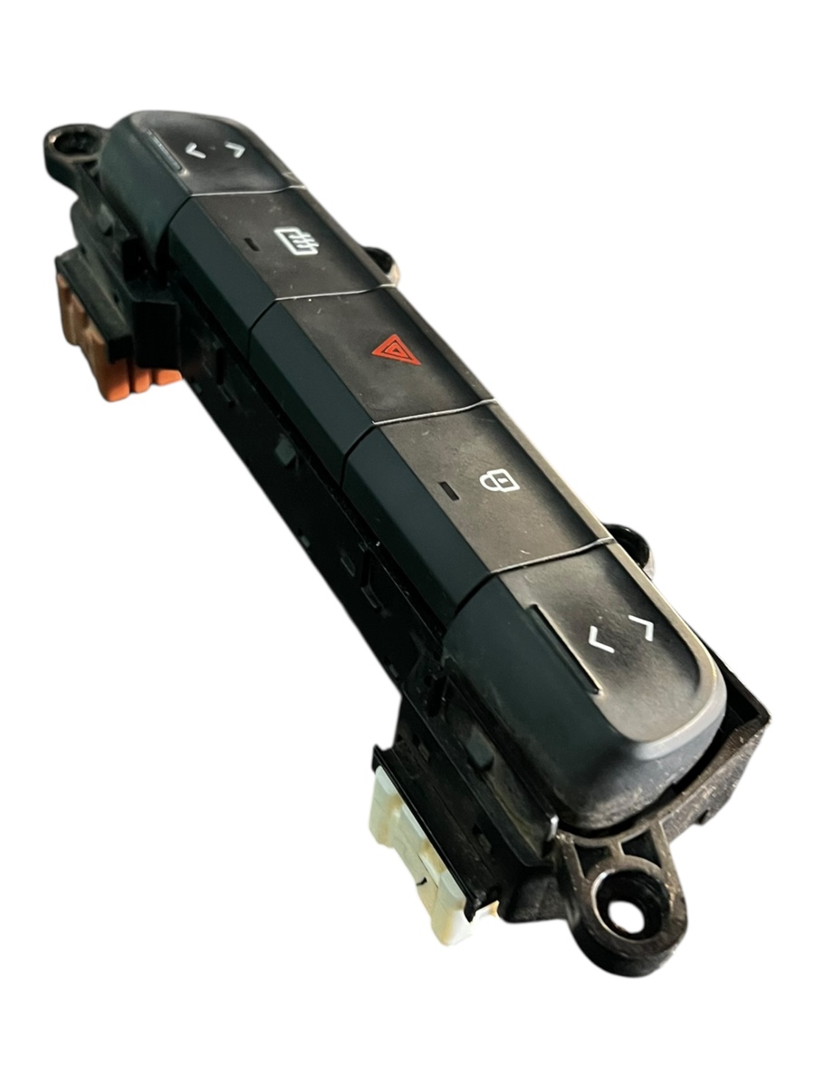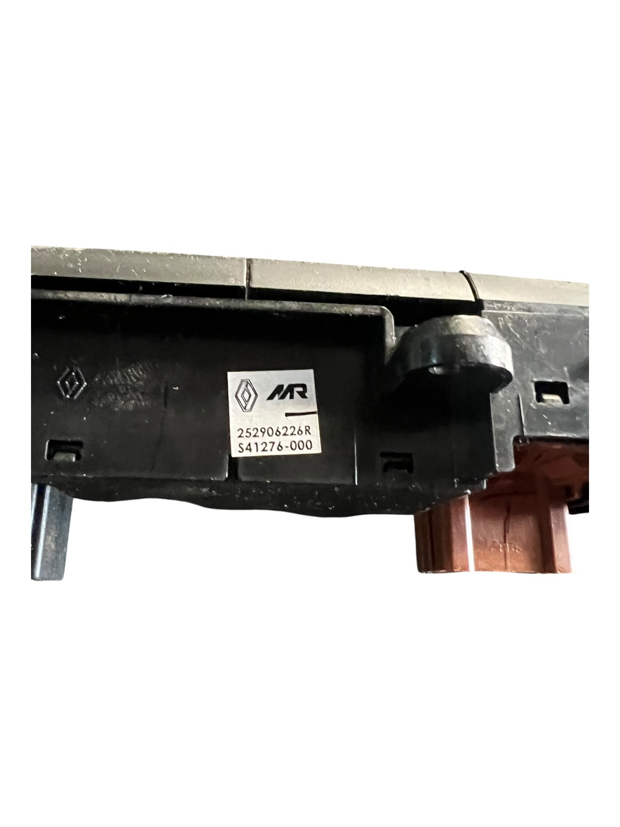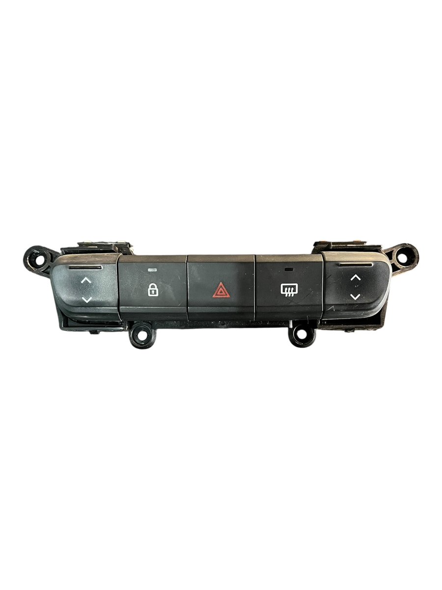 Comando de botões do painel central do Renault Kwid, contendo os botões de vidro elétrico, alerta, trava elétrica e desembaçador traseiro. Peça original Renault, ideal para substituição em caso de falhas, mau funcionamento ou desgaste dos botões.